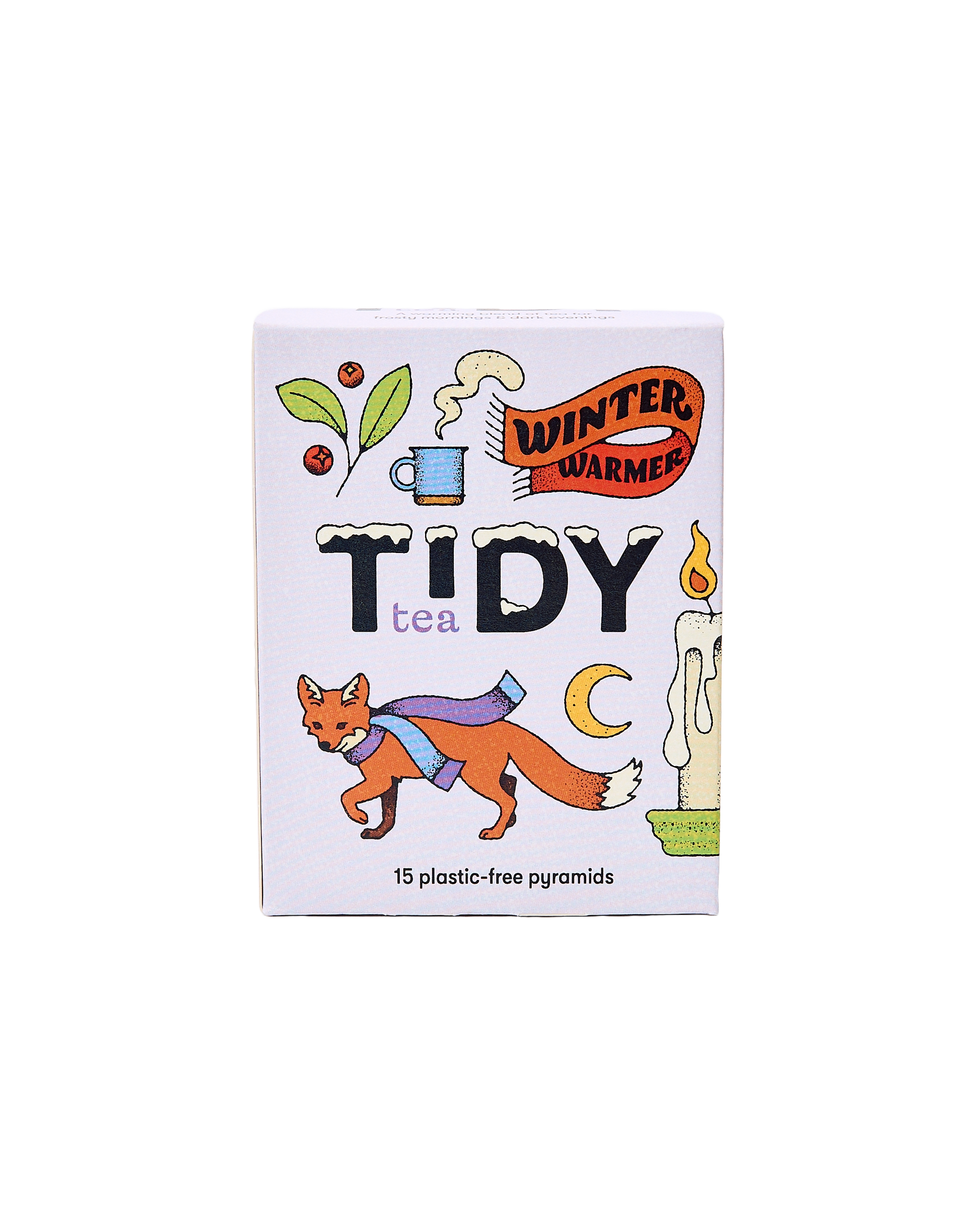 Black tea blended with spices and citrus peel, Tidy’s Winter Warmer is perfect for frosty mornings and dark evenings. Includes 15 plastic-free pyramid bags, all 100% compostable.