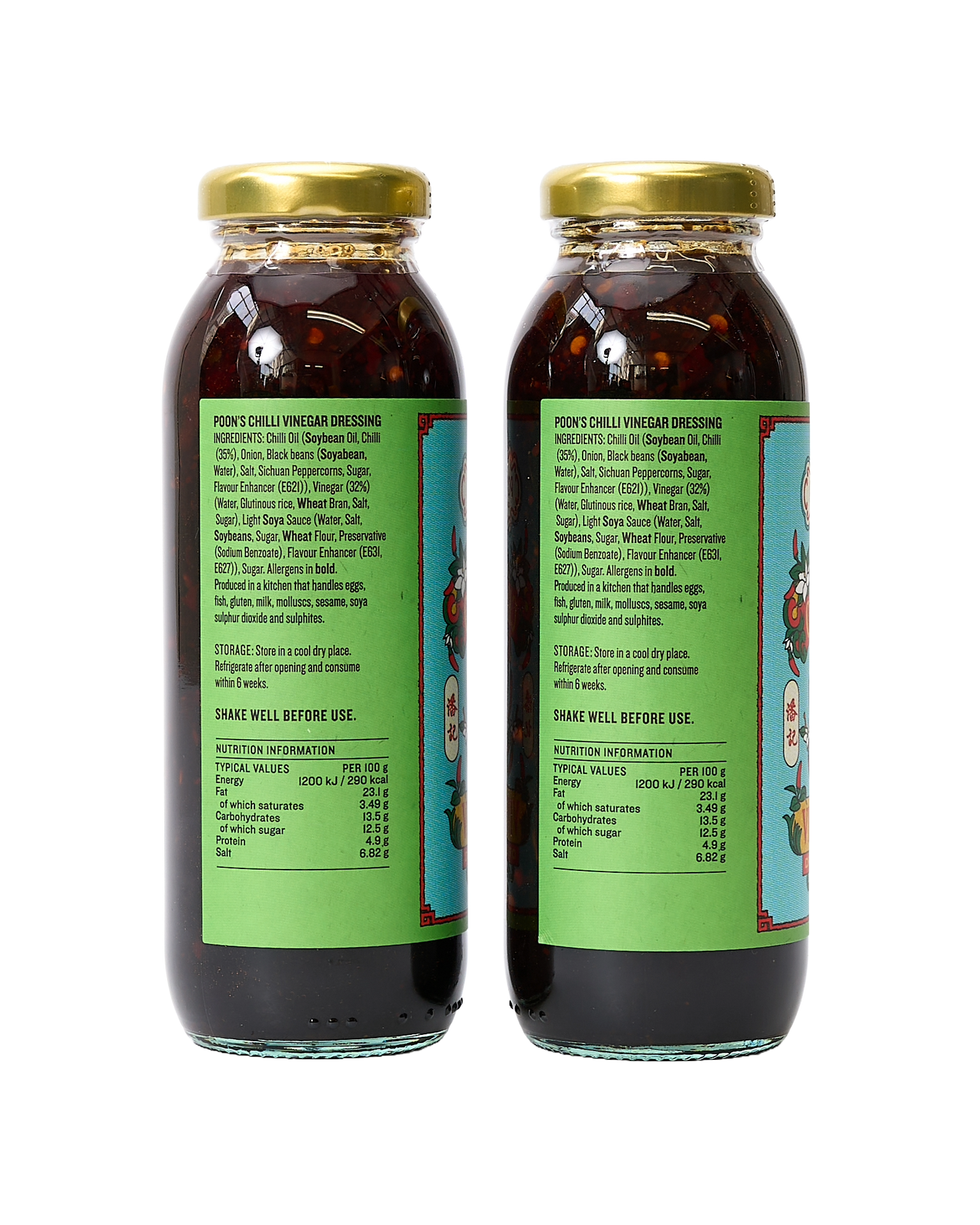 Chilli Oil [Soybean Oil, Chilli (35%), Onion, Black Beans (Soyabeans, Water), Salt, Sichuan Peppercorns, Sugar, Flavour Enhancer(E621)], Vinegar (32%)(Water, Glutinous Rice, Wheat Bran, Salt, Sugar), Light Soya Sauce [Water, Salt, Soybeans, Sugar, Wheat Flour, Preservative (E211), Flavour Enhancer (E631, E627)], Sugar
