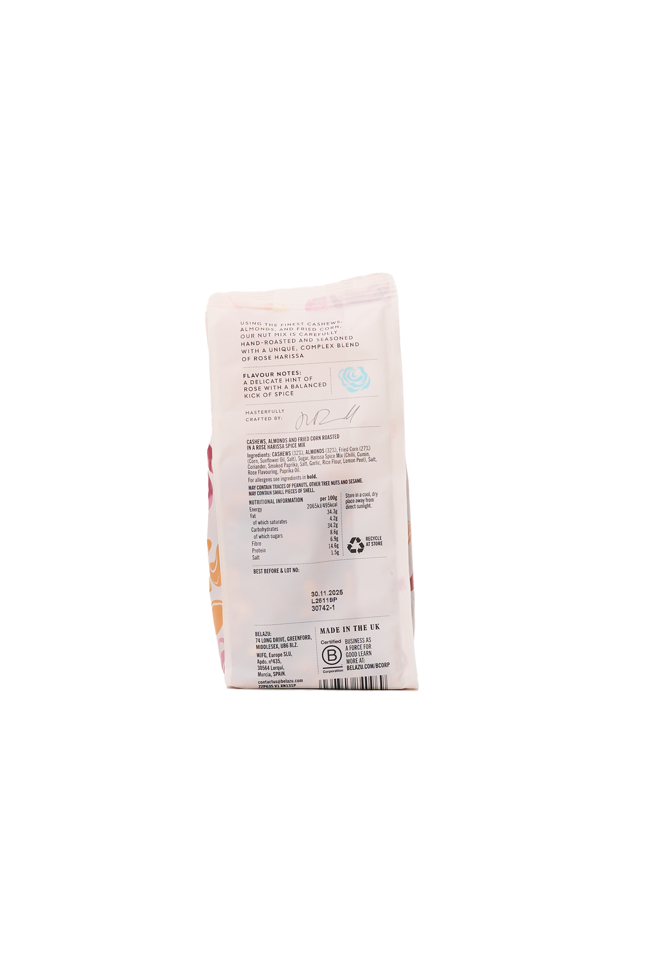 Cashews (33%) almonds (33%), peanuts (26%), sugar, harissa spice dried mix; chilli, cumin, coriander, smoked paprika, salt, garlic, rice flour, lemon peels, rose flavouring, Colour: paprika extract.